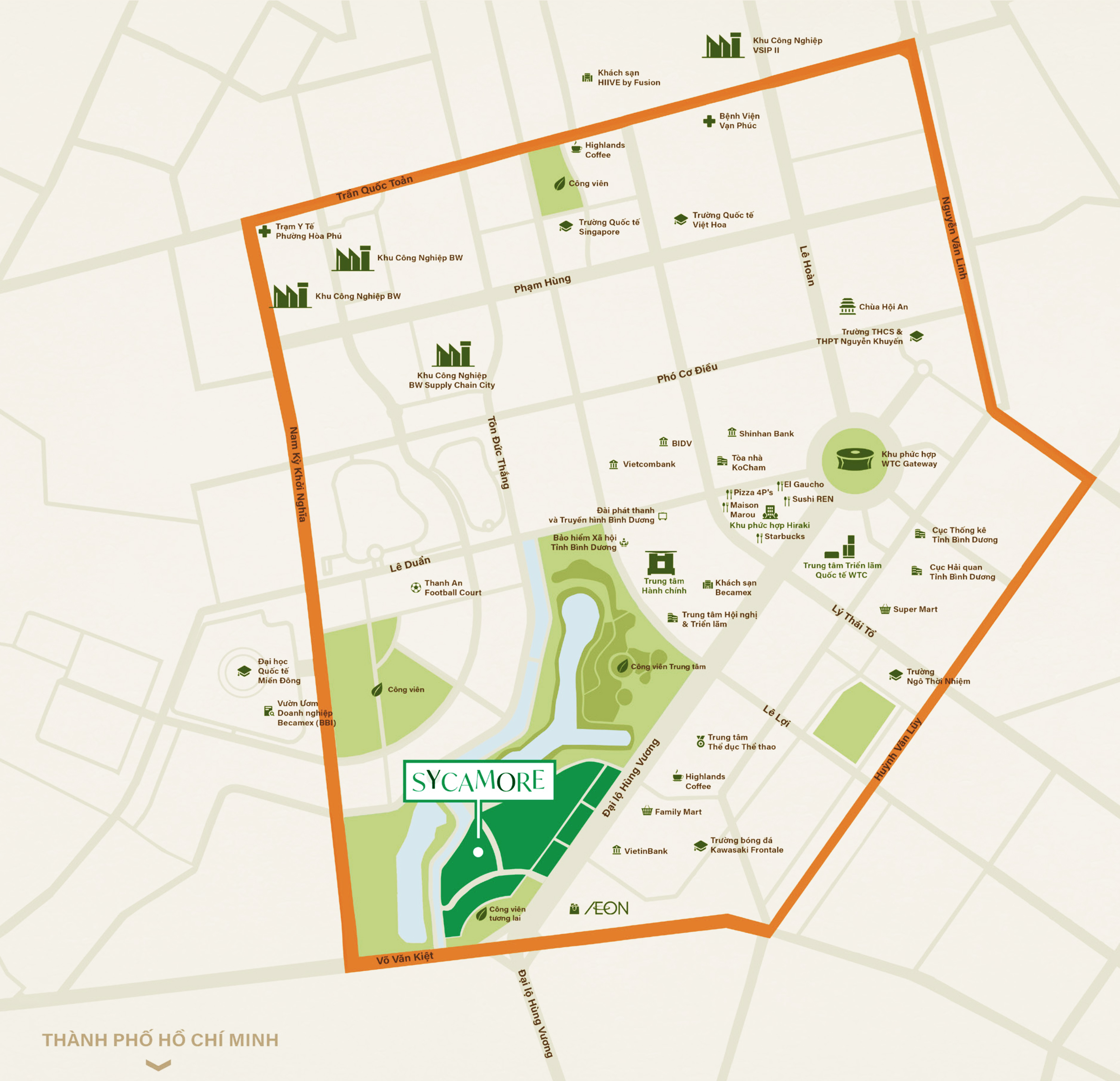 Orchard Mansion @Sycamore tọa lạc trên đại lộ chính của Thành phố mới Bình Dương, và cách Tòa nhà Trung tâm Hành chính tỉnh Bình Dương và Vòng Xoay Al – WTC chỉ với 5 phút lái xe. WORD TRADE CENTER chính là trung tâm thương mại lớn nhất Việt Nam với diện tích 70.000m2 bao gồm trung tâm mua sắm, văn phòng, khách sạn và ga tàu điện ngầm kết nối với tuyến tàu điện ngầm số 1 của thành phố Hồ Chí Minh.