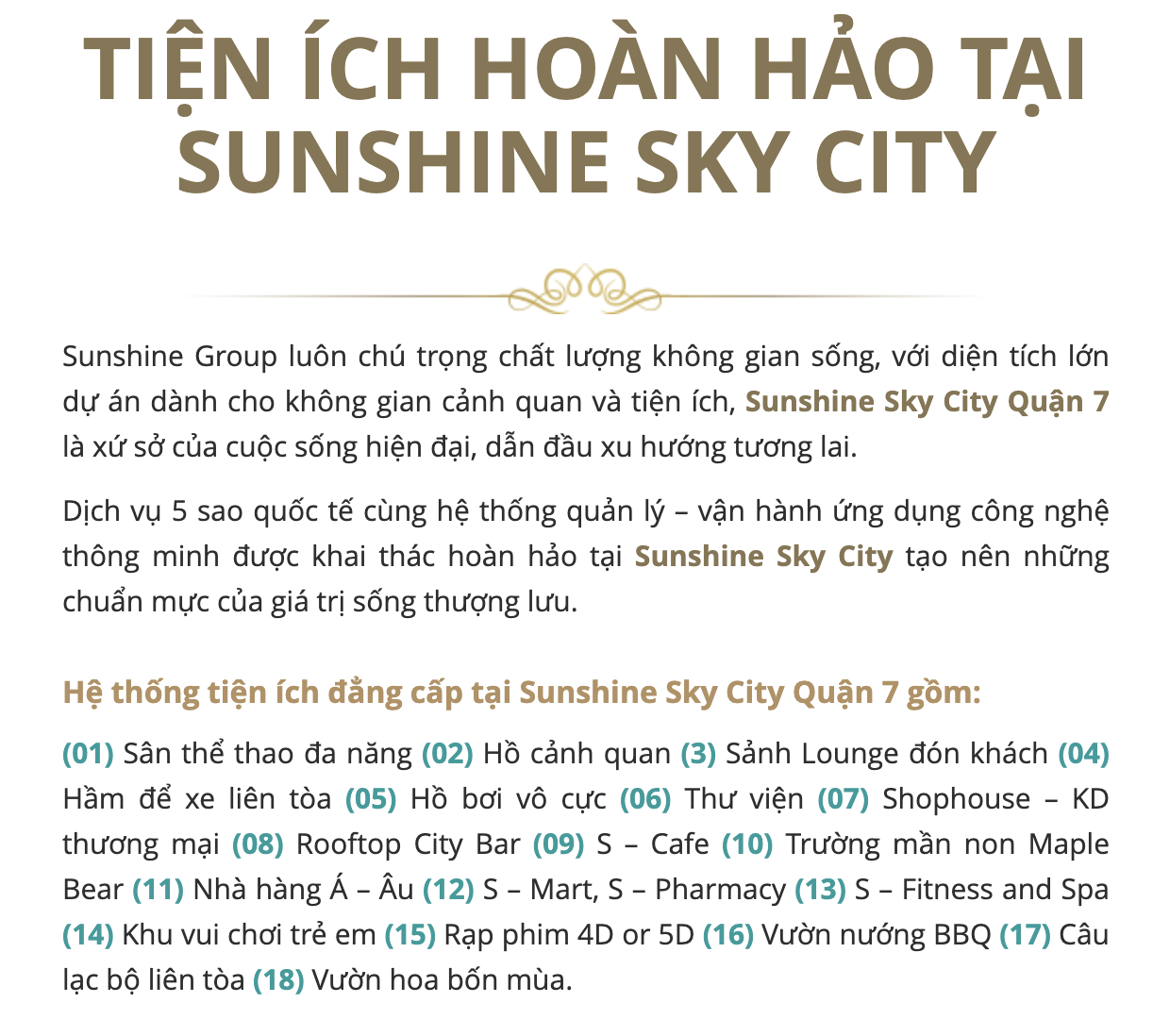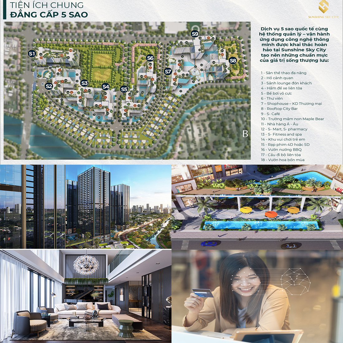 6Sunshine Sky City sở hữu kho tàng tiện ích đồ sộ, ngoài vị trí sở hữu vàng trung tâm của mọi tiện nghi, cùng với view sông tuyệt hảo, Sunshine Sky city còn sở hữu cho mình một kho tàn tiện ích đồ sộ mà khó có một dự án nào sành cùng. Với diện tích lớn dành cho không gian cảnh quan và tiện ích, xứ sở của cuộc sống hiện đại, dẫn đầu xu hướng tương lai. Dịch vụ chuẩn 5 sao quốc tế cùng hệ thống quản lý – vận hành ứng dụng công nghệ thông minh được khai thác hoàn hảo tại Sunshine Sky City, nơi hội tụ trọn vẹn của những chuẩn mực giá trị sống thượng lưu.