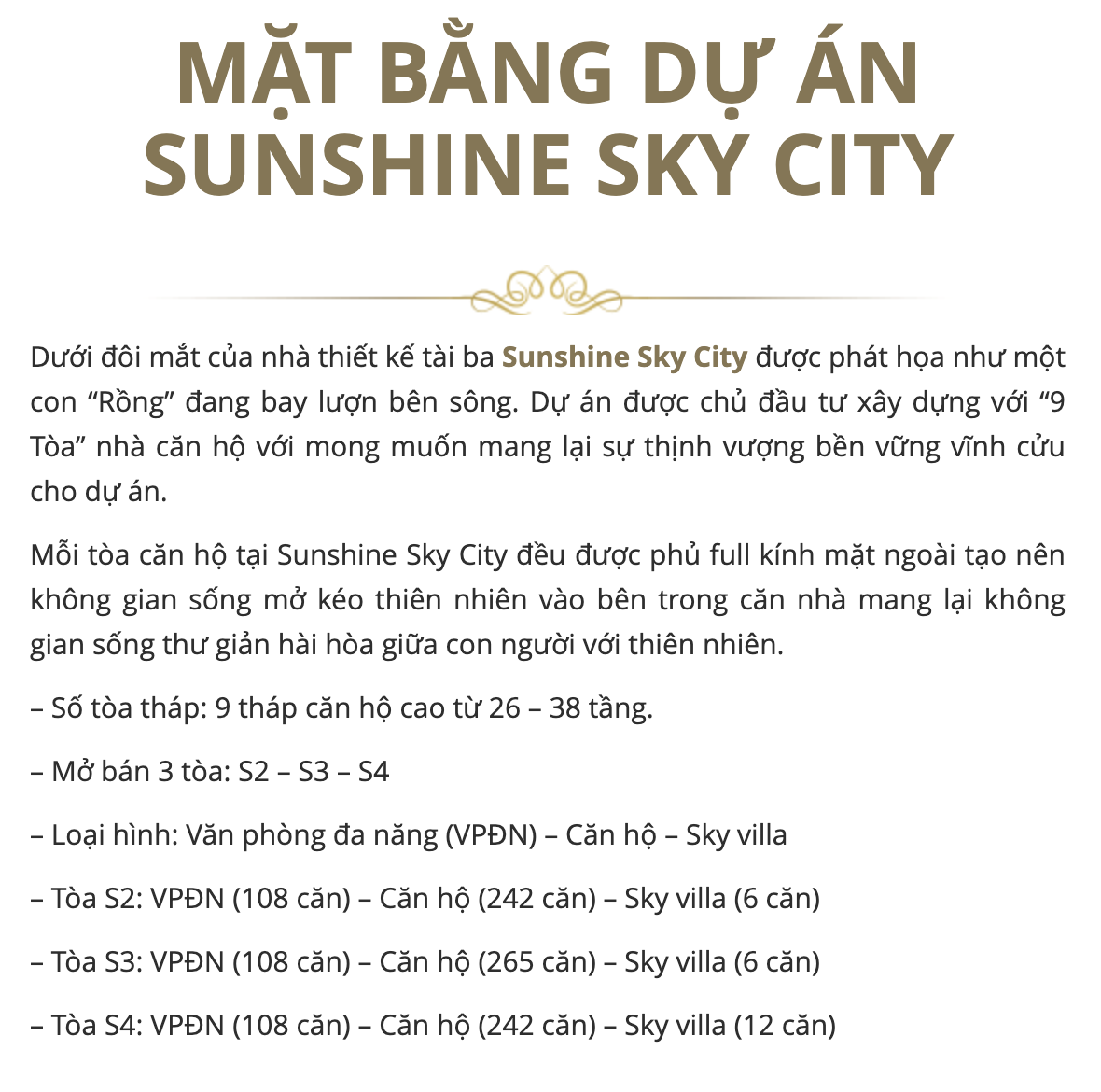 Sunshine Sky City Quận 7 mang dấu ấn của một khu đô thị sinh thái ven sông hạng sang được quy hoạch bài bản chỉn chu trong từng chi tiết. Gói trọn tiện ích đắng cấp quốc tế cùng tinh hoa của xu hướng sống thông minh trong một quần thể sinh thái resort, Sunshine Sky City tiên phong xây dựng một tiêu chuẩn sống thời thượng, thông minh tại Nam Sài Gòn.