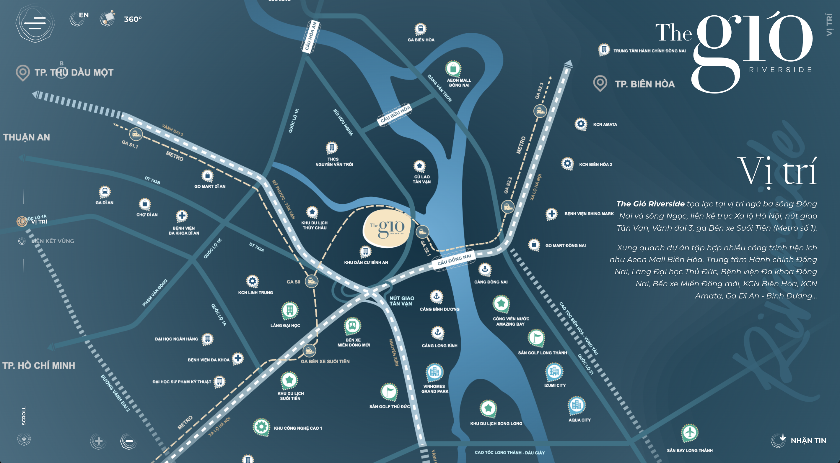 Vị trí Dự án The Gió Riverside tọa lạc ngay mặt tiền đường DT743, phường Bình An, TP Dĩ An, tỉnh Bình Dương, thừa hưởng view sông Đồng Nai tươi mát và cách Quốc lộ 1A nối vào TP Thủ Đức chỉ 500m di chuyển. Nơi đây được nhận định là sở hữu vị trí vàng khi nằm gần các trục giao thông huyết mạch gồm Quốc lộ 13, Quốc lộ 1A, Quốc lộ 1K, cao tốc Mỹ Phước- Tân Vạn, xa lộ Hà Nội, Bùng binh ngã sáu An Phú,…giúp cư dân dễ dàng kết nối với trung tâm thành phố. Hơn thế nữa căn hộ cao cấp The Gió Riverside nằm liền kề với Khu đô thị Làng đại học Thủ Đức, nơi tập chung nhiều trường đại học lớn nhỏ thu hút hàng nghìn sinh viên, giảng viên đang học tập, làm việc và định cư lâu dài tại đây.